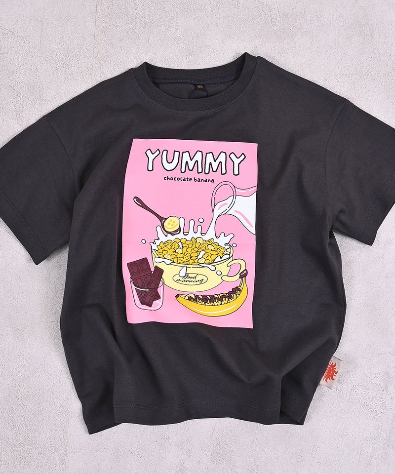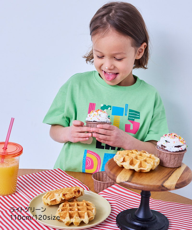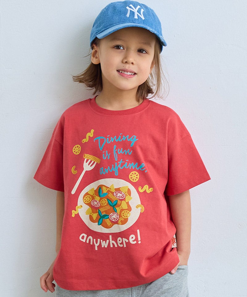 フードやスイーツなどのポップなプリントが目を引く半袖Tシャツです。