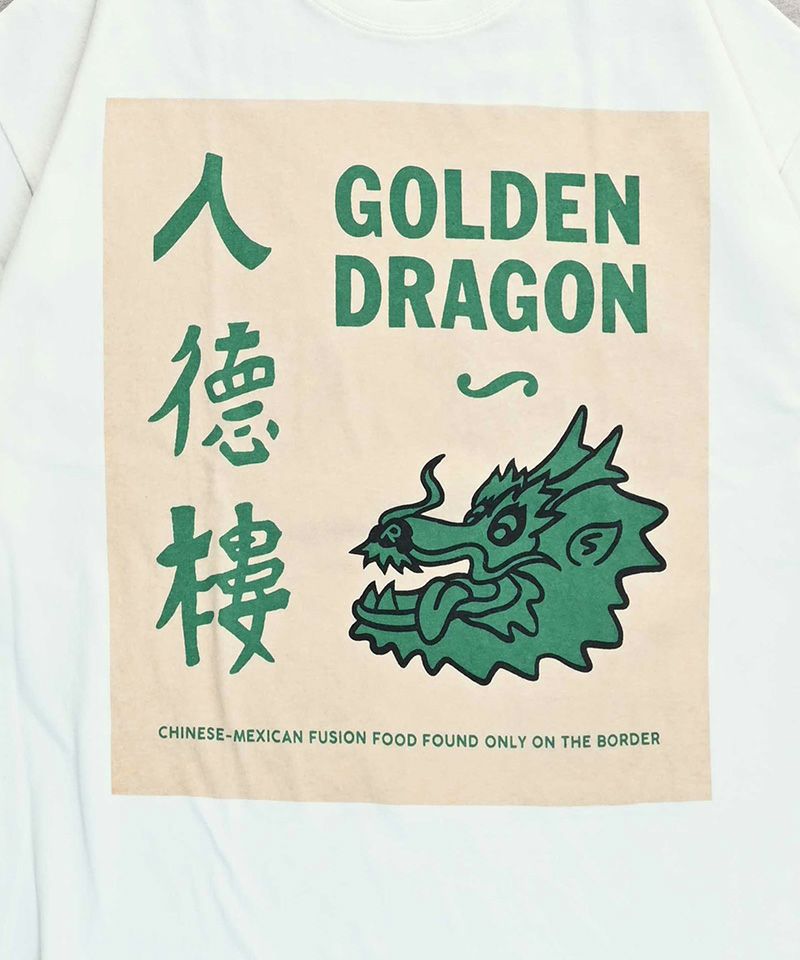 主に国と国の境界線辺りに存在する、架空のメキシコ系アジアンレストラン「Golden Dragon 」(ゴールデン ドラゴン)オリジナルTシャツです。