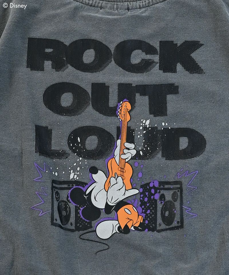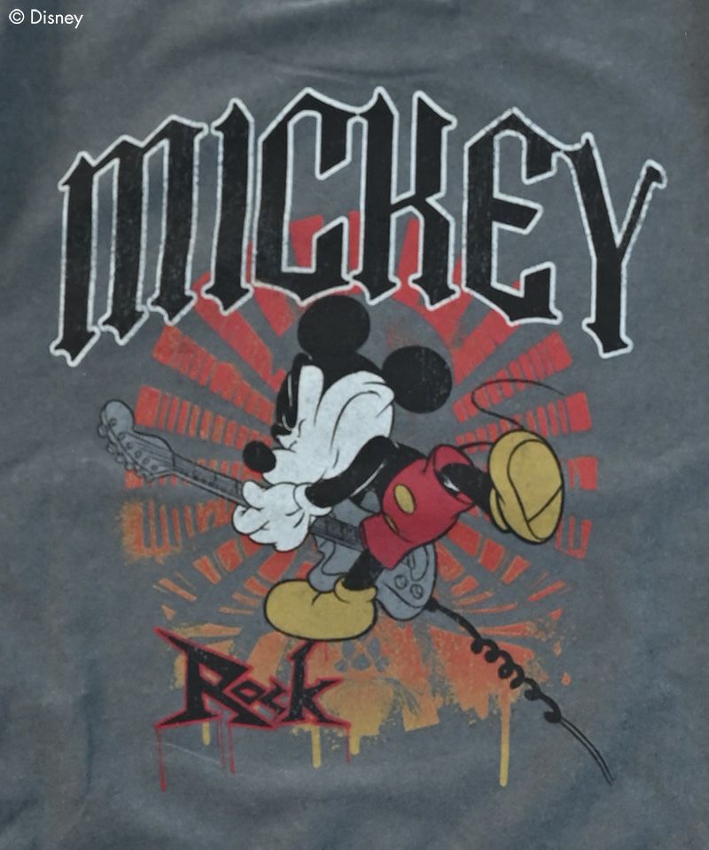 古着っぽいゆるっとしたサイジングにロックテイストのミッキーたちが目を惹く一枚です。