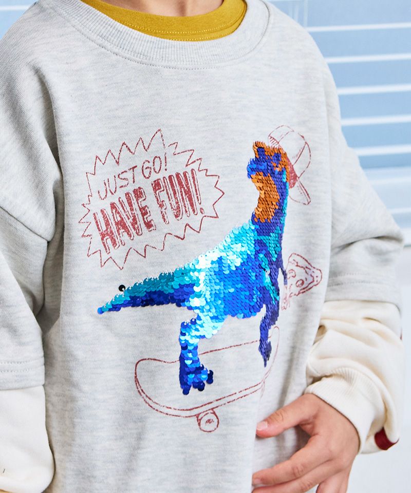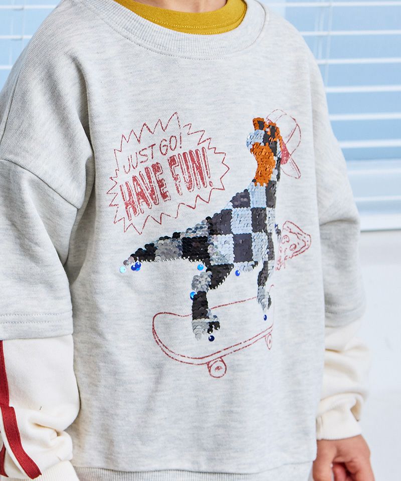 前身頃には、スケボーに乗った恐竜のスパンコール刺繍を大胆にオン。