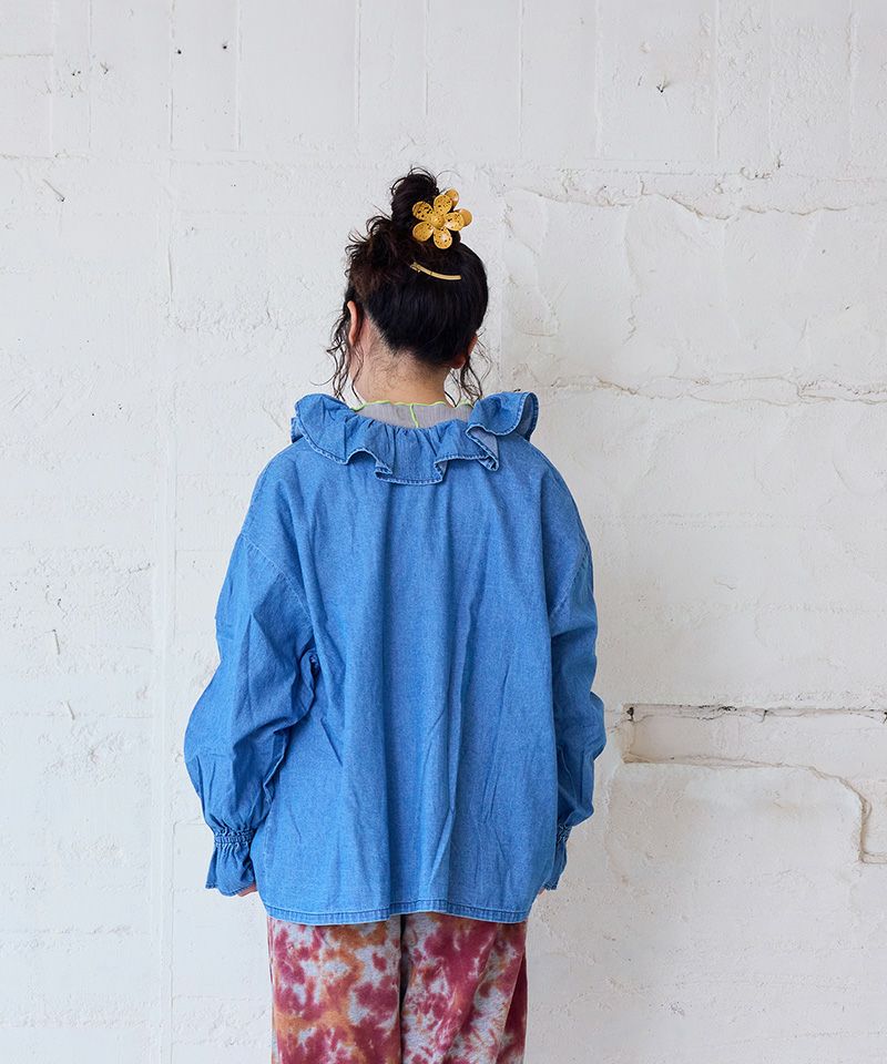 デニム+レオパードプリントにフリルカラーがポイントのブラウス。