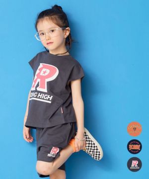 下の子(女の子)用にオレンジを購入。半袖プリントセットアップ黒を、上の子(男の子)に買ったのですが、お揃いになってかわいいです!