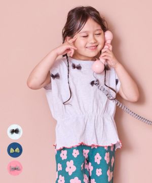 モデルさん着用のグリーン✖️ピンクの花柄のショートパンツを先に買って、上のトップスに悩んでいました。このリボン&メロウ裾、ウエストが絞ってあるデザインがすごくかわいいです。