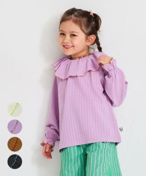 襟がとてもかわいいです。ノースリーブはカラー違いでたくさん持ってたけど秋冬重ね着には長袖が活躍しそうだな、と購入しました。着せるのが楽しみです。
